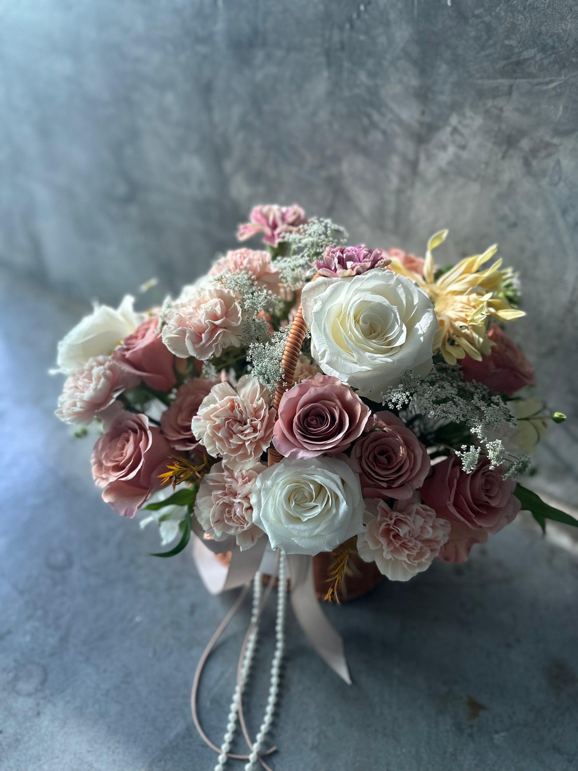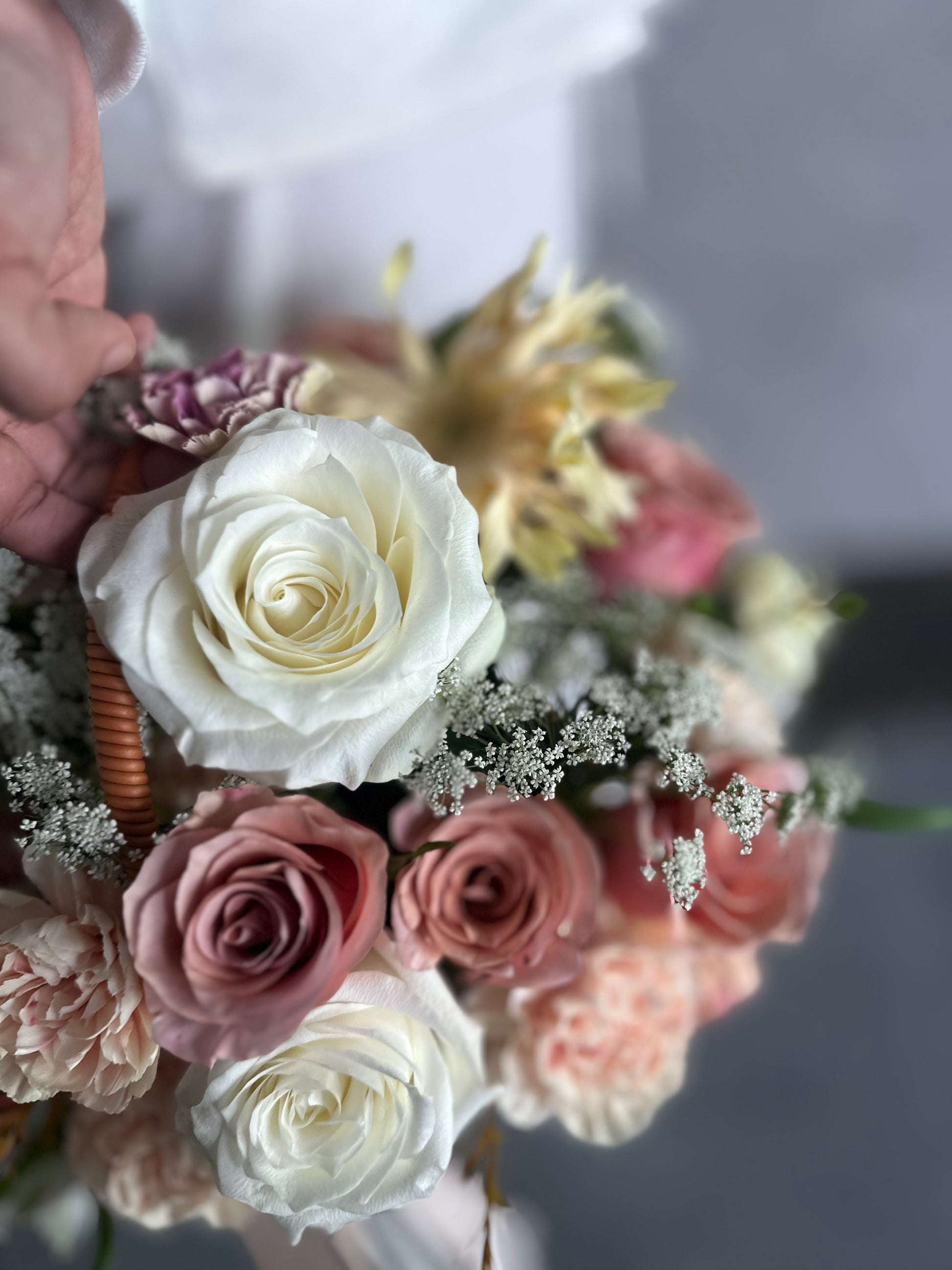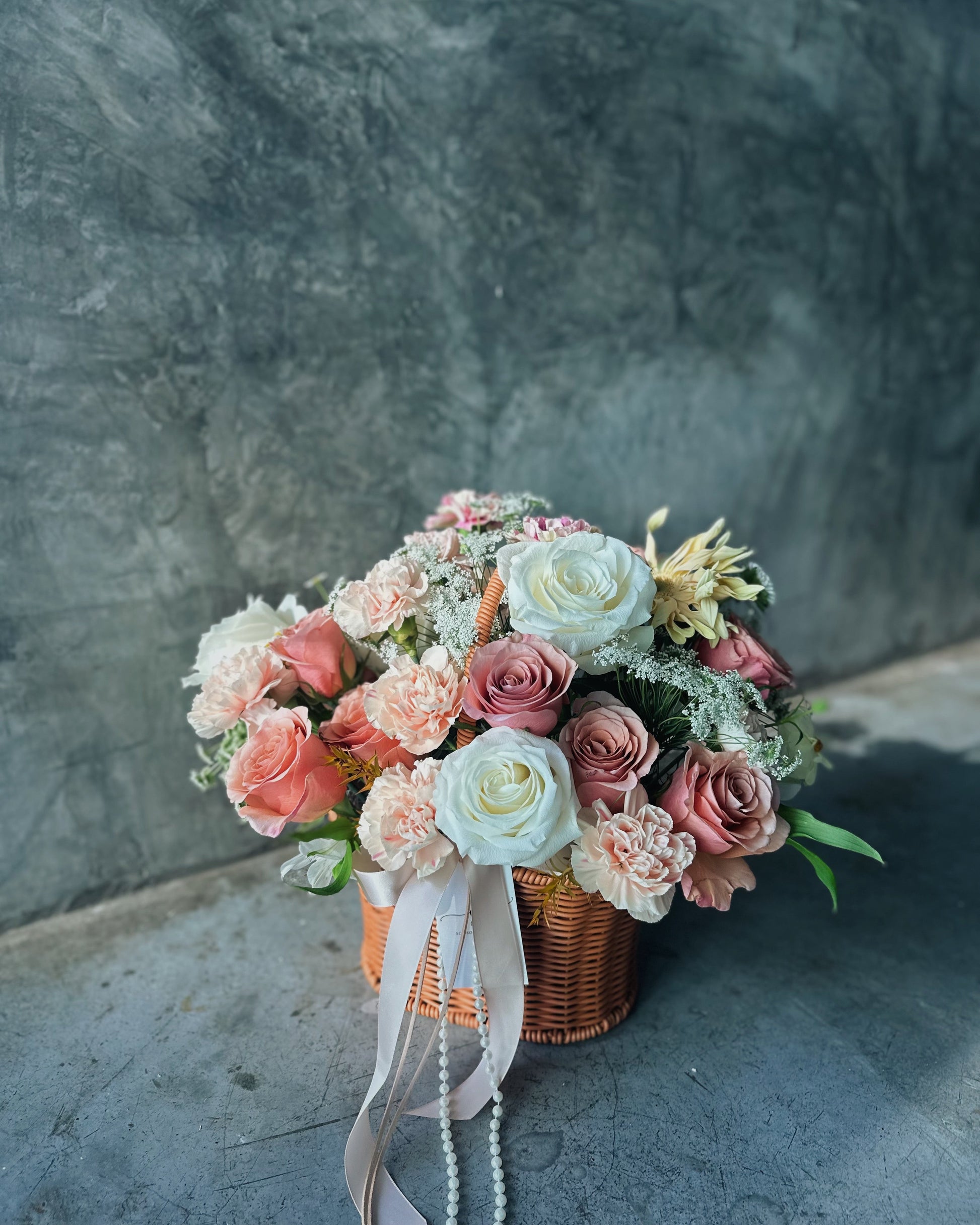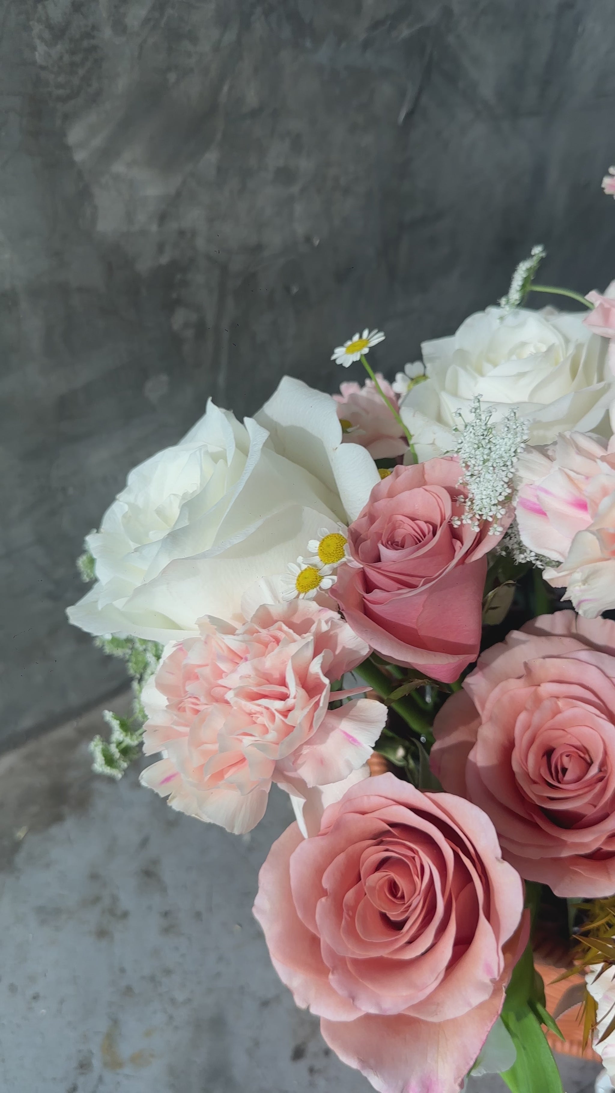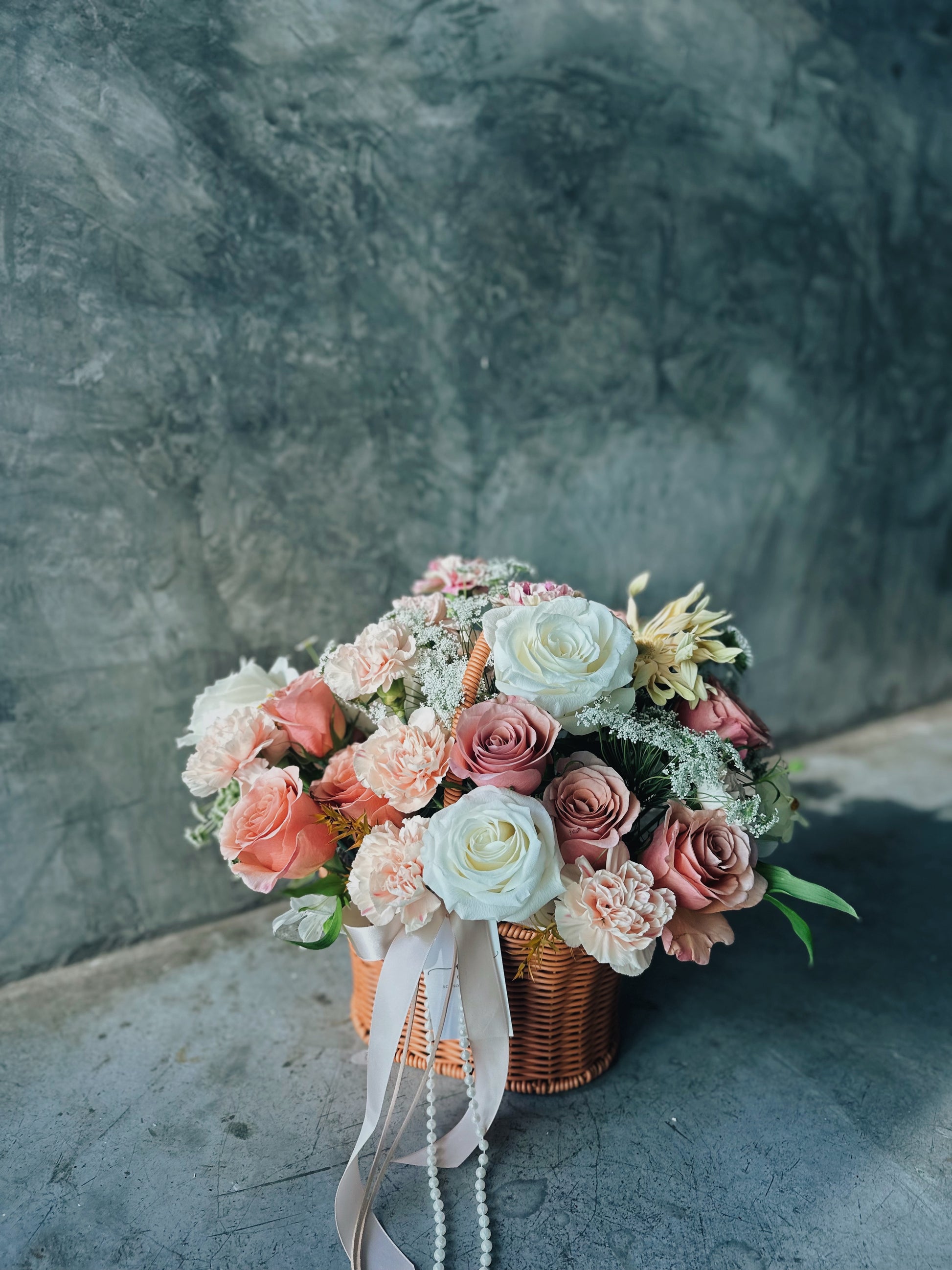 Due to seasonal changes, freshness, and potential shipping shortages, the selection of fresh flowers may vary. The flowers you receive may differ from the reference image; however, we will substitute with flowers of similar value and tone, ensuring the overall look and feel of the arrangement is preserved.