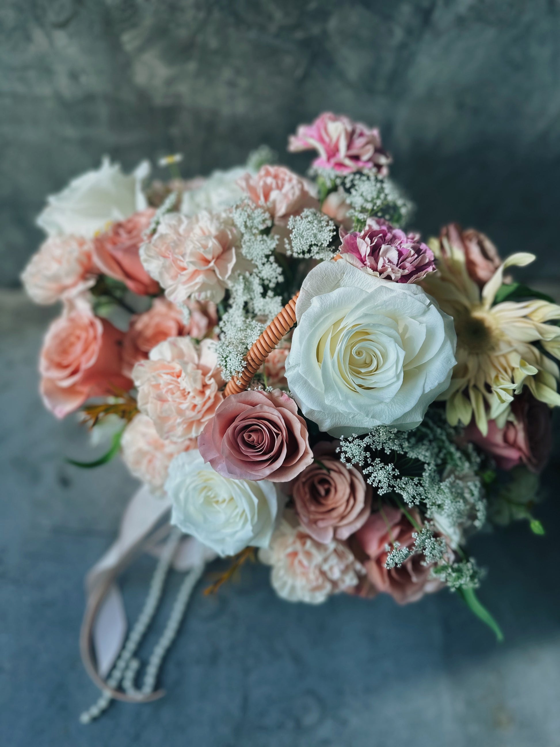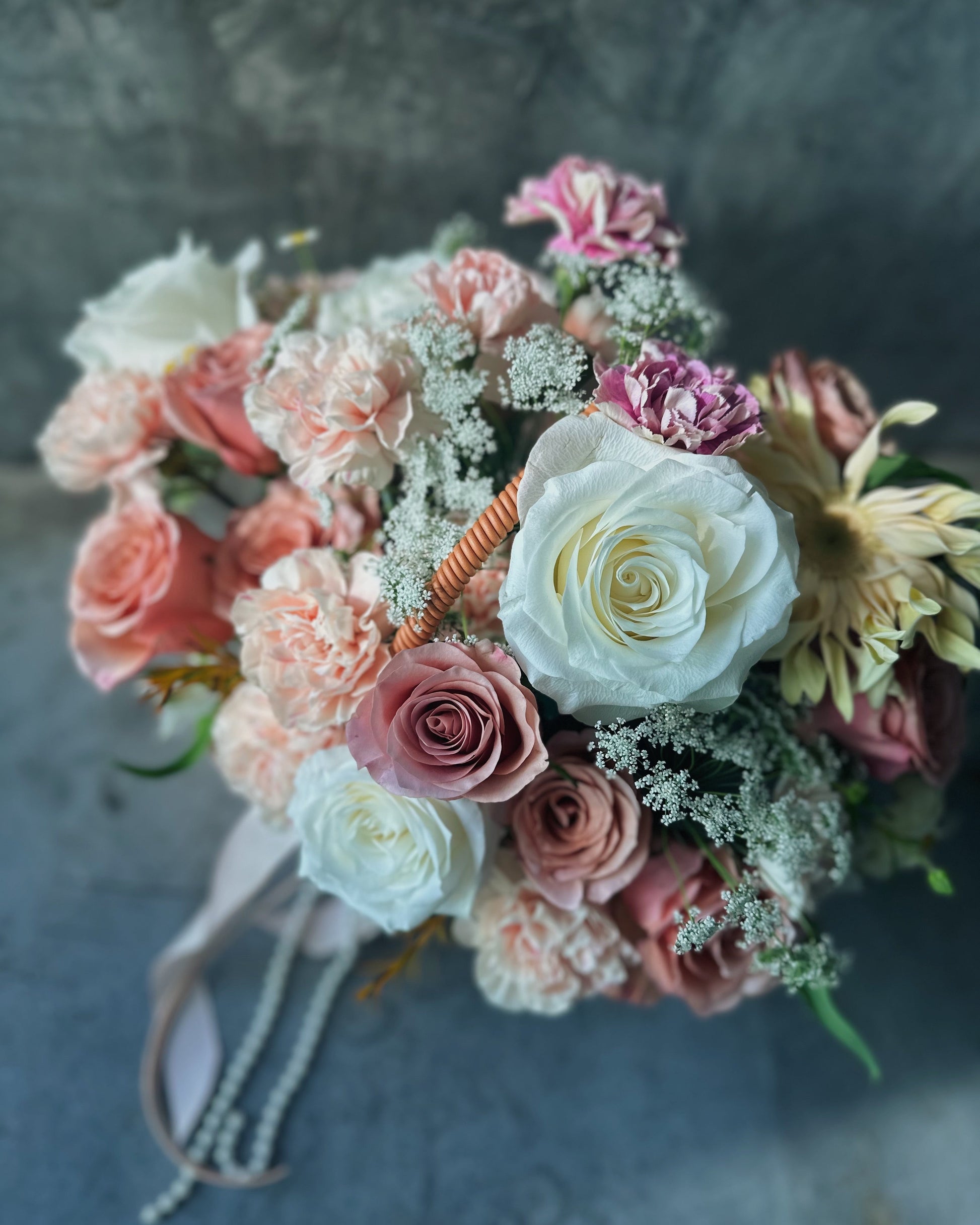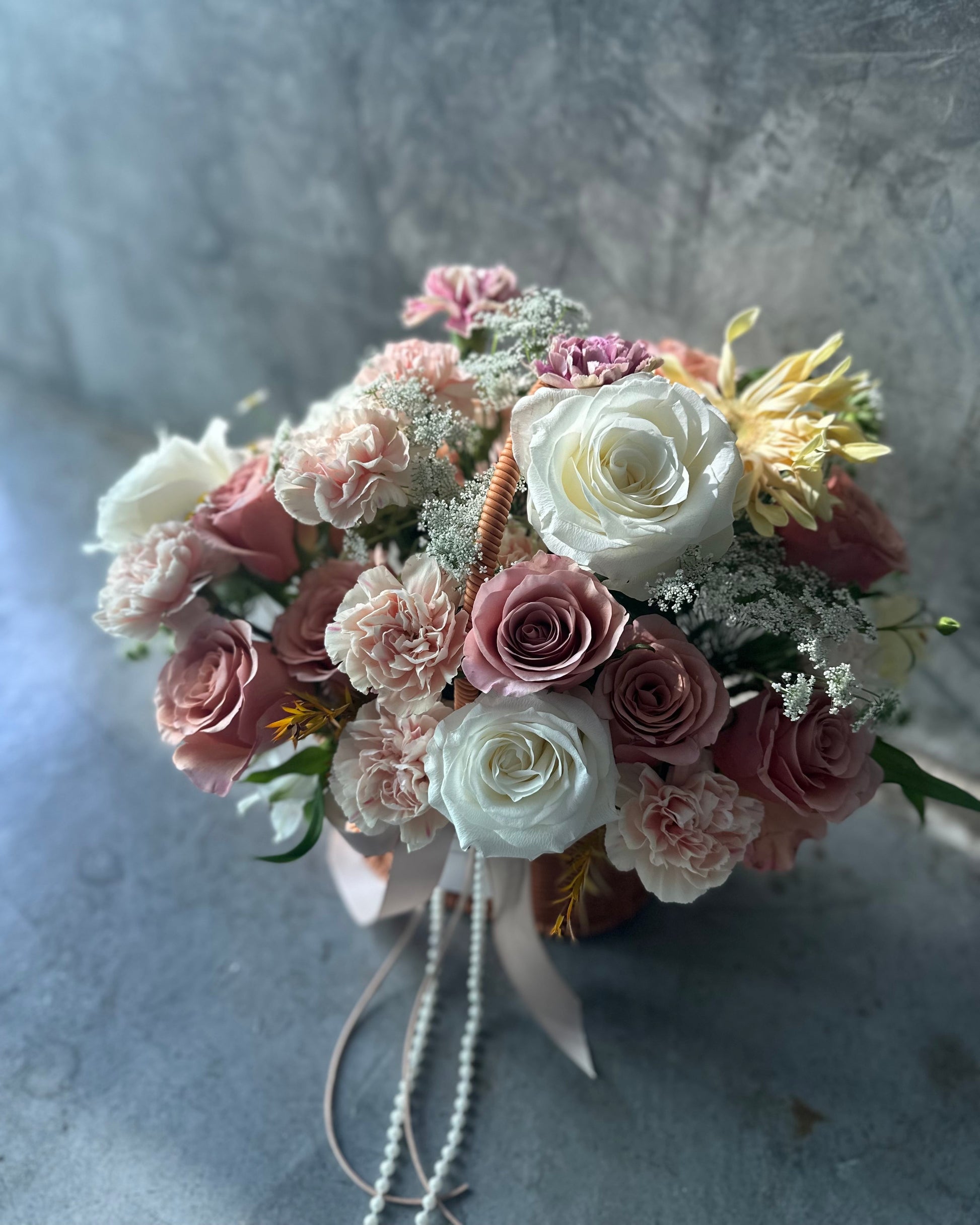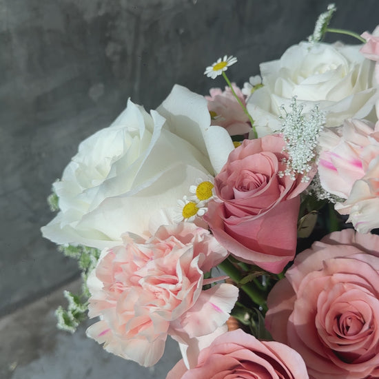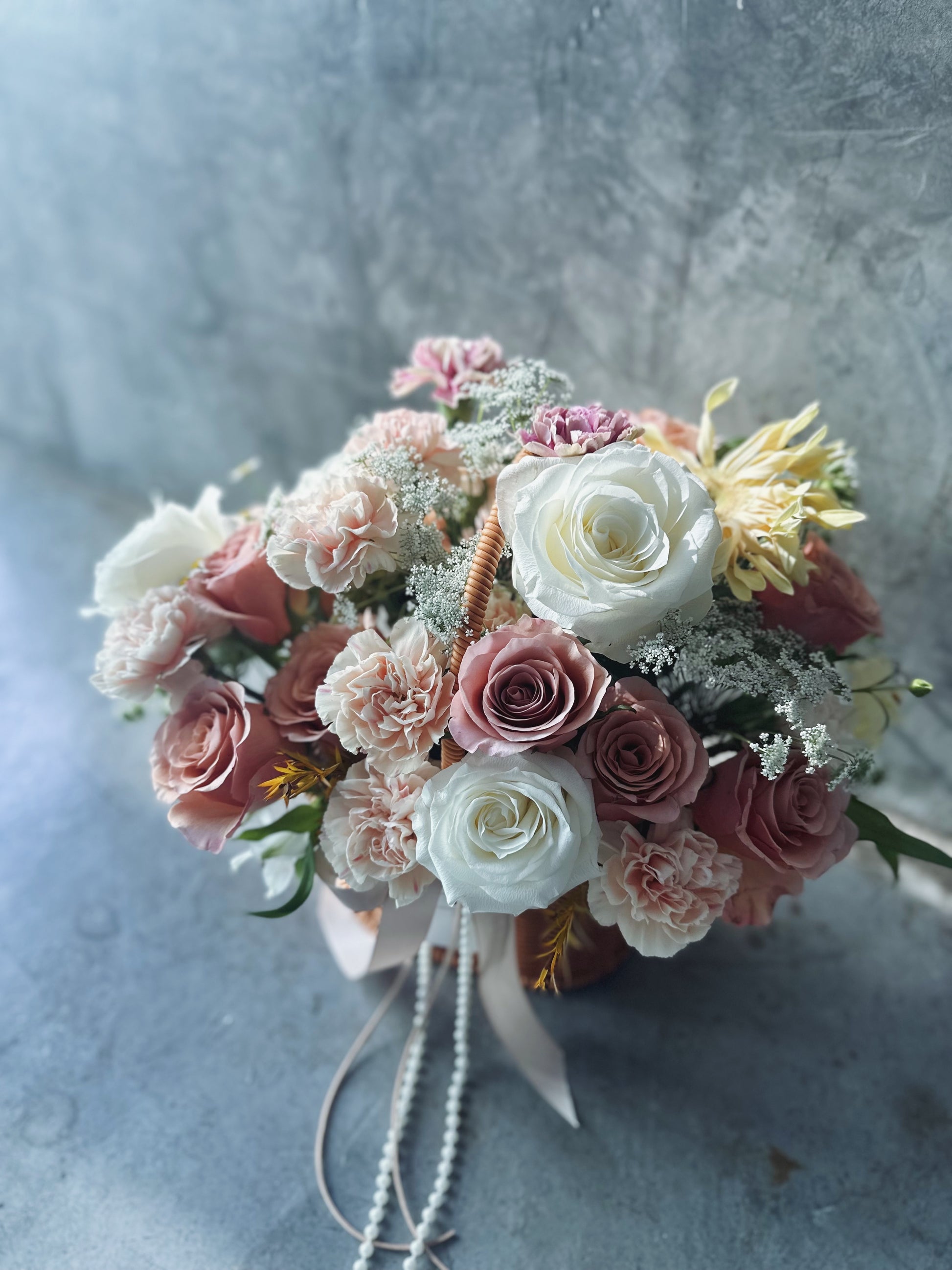 Due to seasonal changes, freshness, and potential shipping shortages, the selection of fresh flowers may vary. The flowers you receive may differ from the reference image; however, we will substitute with flowers of similar value and tone, ensuring the overall look and feel of the arrangement is preserved.