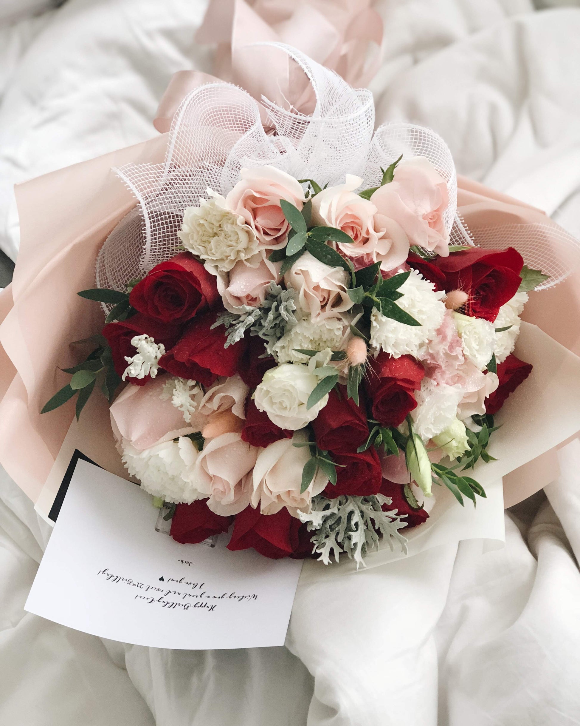 Due to seasonal changes, freshness, and potential shipping shortages, the selection of fresh flowers may vary. The flowers you receive may differ from the reference image; however, we will substitute with flowers of similar value and tone, ensuring the overall look and feel of the arrangement is preserved.