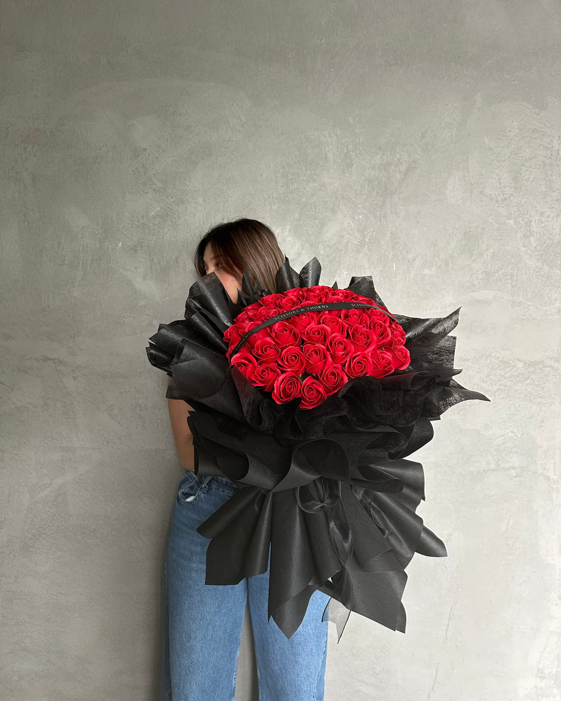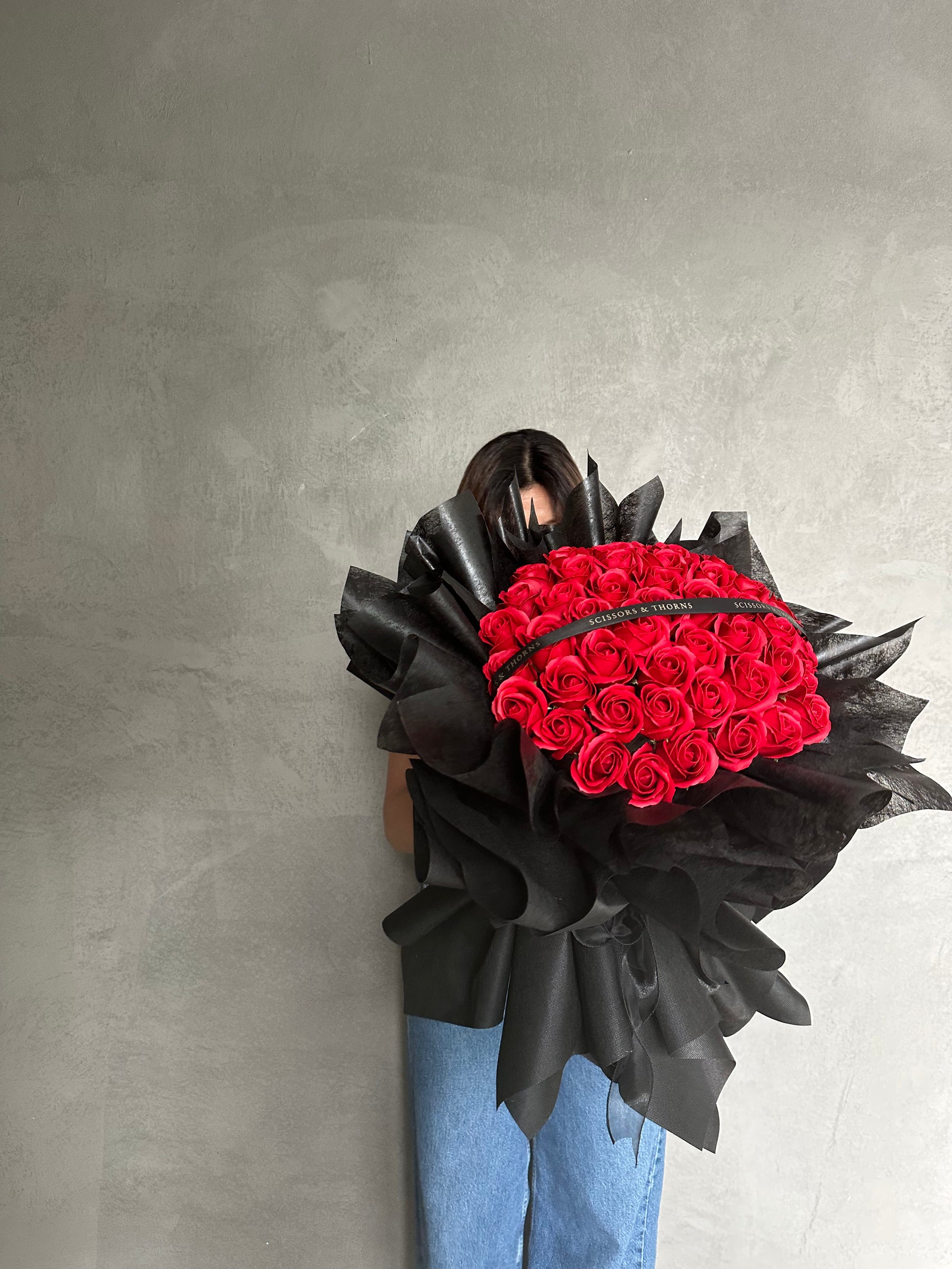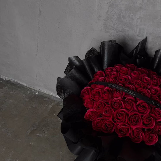Make a bold and unforgettable statement with this luxurious bouquet of 50 red soap roses, elegantly wrapped in classic black wrapping for a striking contrast. Designed to symbolise deep love, passion, and sophistication, this everlasting bouquet is perfect for anniversaries, Valentine’s Day, proposals, or grand romantic gestures.