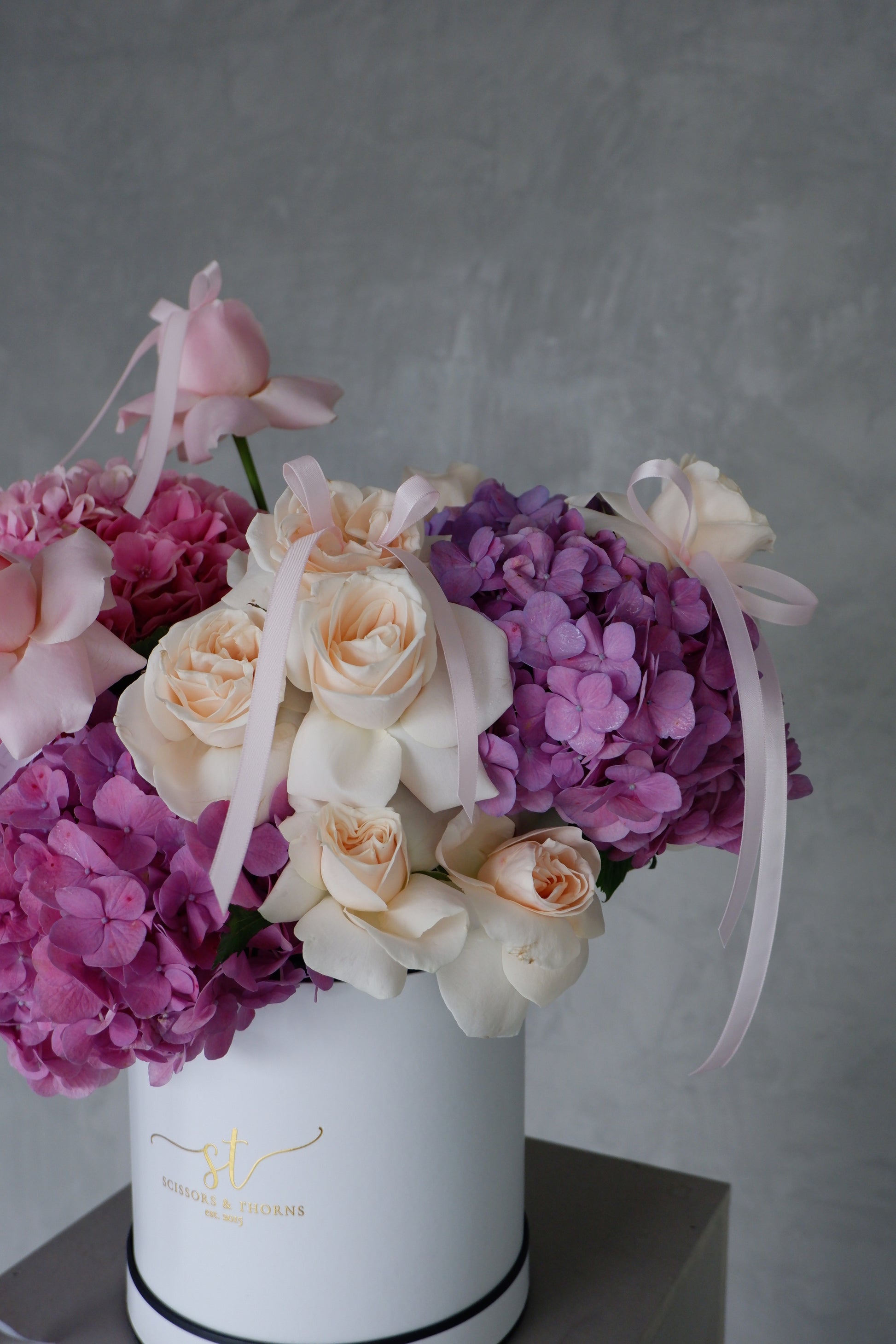 Luna Rosé Floral Box brings together soft pink–purple hydrangea and romantic blush and ivory roses in a refined box arrangement. A timeless floral piece that radiates elegance and warmth.