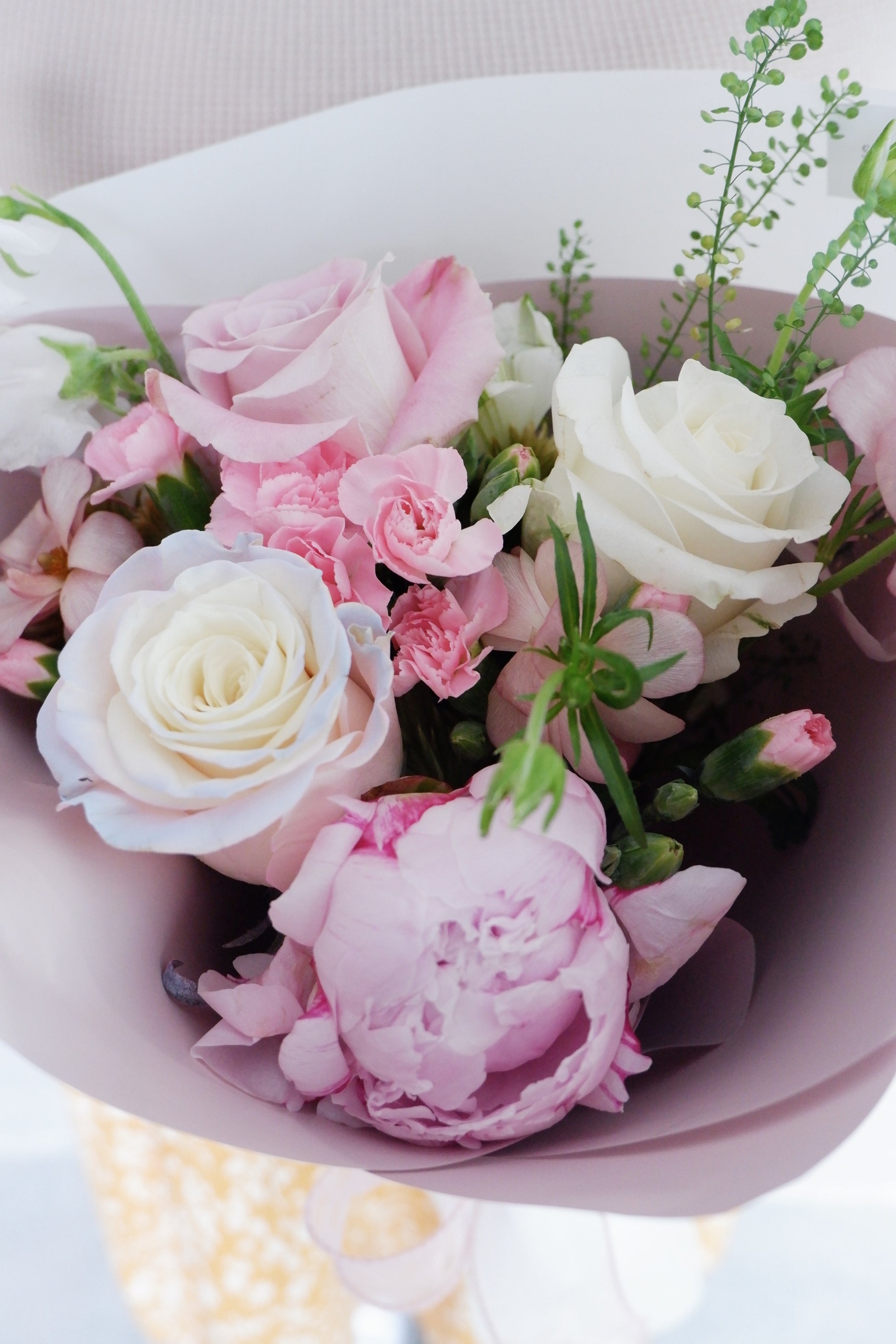 - Medium Hand-tied Bouquet – a floral hug, wrapped with care (Peonies, Roses, Tulips, Spray Carnations & Fillers.)